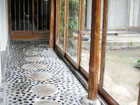 | 中庭の池をご覧になりながら石の廊下を通ると、離れ座敷がございます。部屋は材木から吟味して作られ、昔の職人さんならではの技で、1本の焼杉で作られた天井など、落ち着いた雰囲気です。お泊りや小宴会にご利用いただいております。 | ![]() |